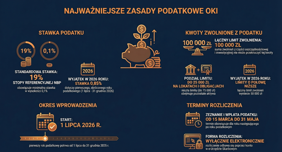 - suma wartości aktywów zwolnionych zarówno w OKI o charakterze oszczędnościowym, jak i w OKI o charakterze inwestycyjnym nie może przekroczyć wartości 100 000 zł. Oznacza to, że posiadając np. 25 tys. zł w obligacjach w części inwestycyjnej, limit ten wyniesie 75 tys. zł.