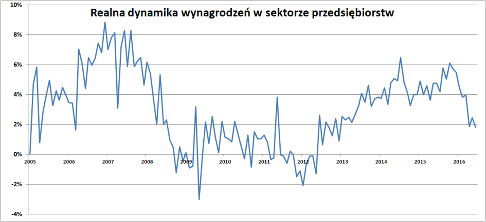 Nie wszystkie statystyki pozwalają mówić o „rynku pracownika”. Frapuje zwłaszcza niski wzrost wynagrodzeń. Przez ostatnie trzy lata „przeciętne wynagrodzenie brutto w sektorze przedsiębiorstw” rosło w tempie 3-5% rdr. W warunkach łagodnej deflacji był to wynik całkiem przyzwoity. Ale już przy 2-procentowym ubytku siły nabywczej polskiego pieniądza (tzw. inflacja CPI) jest to rezultat po prostu słaby.