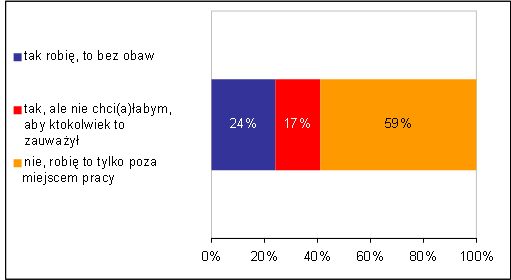 Tylko co czwarty ankietowany przyznał, że bez obaw przegląda oferty pracy korzystając ze służbowego dostępu do Internetu. Kolejne 17% osób też wykorzystuje do tego firmowe zasoby, ale pilnuje, by nikt ich na tym nie przyłapał.