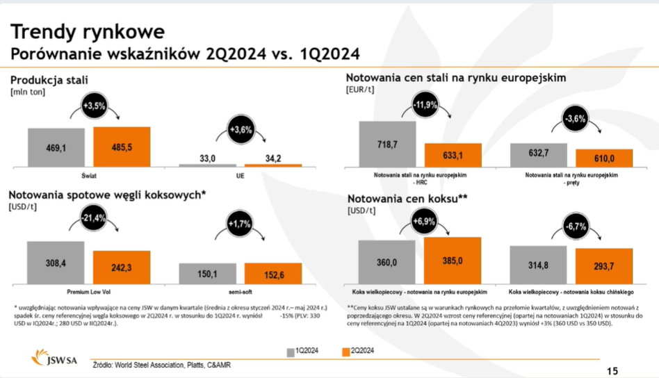 "Porównując pierwsze półrocze bieżącego roku i pierwsze półrocze roku ubiegłego, produkcja w stali globalnej utrzymała się na podobnym poziomie. Natomiast w Unii Europejskiej wzrosła o niespełna procent. Oznacza to zatrzymanie systematycznych spadków produkcji stali surowej w Unii Europejskiej które obserwowaliśmy w ostatnich dwóch latach. Niestety, nie zmienia to faktu że produkcja stali surowej w pierwszym półroczu bieżącego roku była o ponad 13% niższa od analogicznego okresu w 2022 roku zgodnie z dostępnymi danymi" - powiedziała Jolanta Gruszka wiceprezes JSw ds. handlu.
