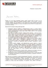 Potrzebujemy czasu, czyli Państwa cierpliwości i jeszcze raz zaufania. [...] W związku z tym w dniach 7-23 stycznia przeprowadzamy kolejną emisję certyfikatów OPERA FIZ. Może brzmi to nierealistycznie, ale naszym celem jest pozyskanie większej kwoty, niż wypłynęło w wyniku umorzeń na koniec grudnia 2008 (kilkanaście milionów zł, czyli około 5% aktywów Funduszu). [...]