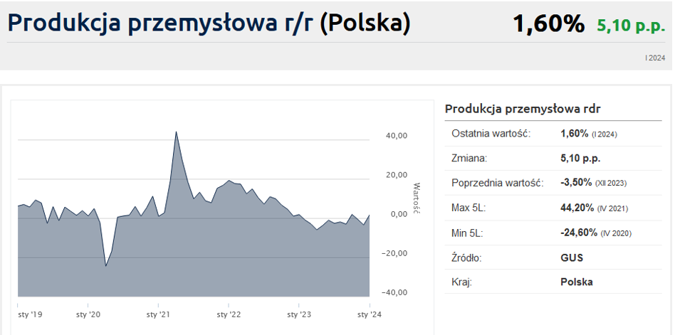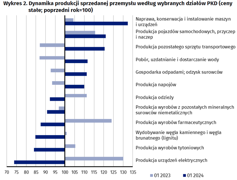W praktyce był to więc miesiąc stagnacji w polskim przemyśle. Indeks produkcji przemysłowej w styczniu utrzymał się tylko nieznacznie powyżej poziomów ze stycznia 2022 i stycznia 2023 roku. Główną tego przyczyną jest słabość gospodarki Niemiec, będącą głównym rynkiem zbytu dla polskich wyrobów przemysłowych.