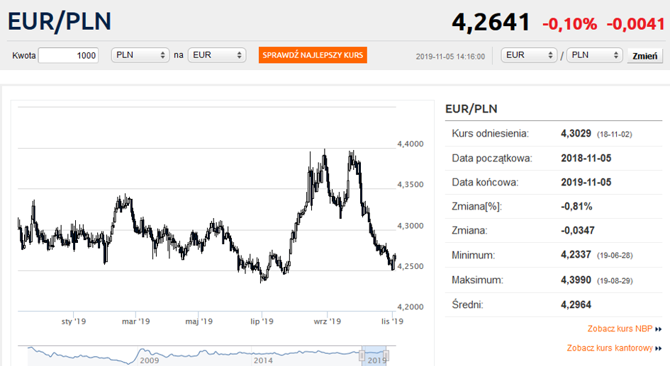 | EUR | 4,33 zł | 4,33 zł | 4,30 zł | 4,30 zł | 4,30 zł |