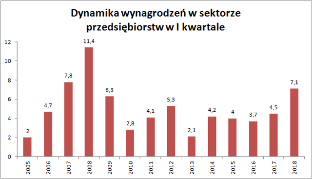 Za to nieco wyższy od rynkowych oczekiwań (6,5% rdr) był wzrost przeciętnego wynagrodzenia, który wyniósł w marcu 6,7% rdr wobec 6,8% odnotowanych w lutym i 7,3% w styczniu. W całym pierwszym kwartale GUS oszacował wzrost płac na 7,1%, co było najwyższym "pierwszokwartalnym" wynikiem od 2008 roku.