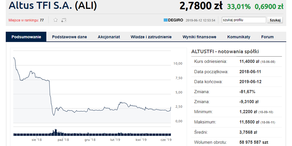 Warto także pamiętać, że Altus - jako spółka - znacząco ograniczył działalność, sporo klientów wycofało się z jego usług, liczne fundusze przeniesiono także do Rockbridge TFI. Najlepiej o ograniczeniu działalności niech świadczy fakt, że jednostkowe przychody Altusa w I kwartale 2019 roku wyniosły 25,8 mln zł wobec 75,1 mln zł w porównywalnym okresie rok temu.