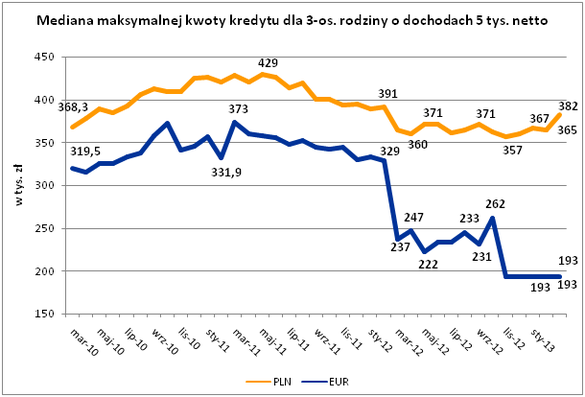 3-osobowa rodzina osiągająca dochód na poziomie 5 tys. zł netto może dziś liczyć przeciętnie na 382 tys. zł kredytu. To o 17 tysięcy więcej niż w grudniu ub. r. i jednocześnie najwięcej od grudnia 2011 roku, który był ostatnim miesiącem obowiązywania starych zasad wyliczania zdolności kredytowej, czyli bez wymogu ograniczenia okresu kredytowania do 25 lat i bez wymogu ograniczenia relacji raty do dochodu netto do 50% lub 65% (te wymagania wprowadziła jeszcze poprzednia wersja rekomendacji T w grudniu 2011 roku). Nadzór chce co prawda odejść od tych ograniczeń jeszcze w tym roku, ale nawet bez tego ruchu kredyty stają się z miesiąca na miesiąc bardziej dostępne. Jest to zasługa spadającej stopy WIBOR, która skutkuje niższym oprocentowaniem, a tym samym mniejszą comiesięczną ratą. A to z kolei zasługa już dokonanych oraz oczekiwanych obniżek stóp NBP. W listopadzie i w grudniu RPP obniżyła już stopy w sumie o 50 pkt. bazowych. Dziś spodziewana jest kolejna obniżka o przynajmniej 25 punktów. W sumie w ciągu trzech miesięcy stopy powinny spaść o 75 pkt. bazowych i wszystko wskazuje na to, że to jeszcze nie koniec cięć.
