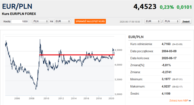 Część ekonomistów potraktowało to zdanie jako sugestię, że Radzie nie podoba się obecny kurs złotego. Przypomnijmy, że po głównym uderzeniu koronawirusowego kryzysu w marcu kurs euro podskoczył z ok. 4,30 zł do 4,63 zł, osiągając najwyższy poziom od 11 lat. Ale potem złoty odrobił część strat – kurs EUR/PLN obniżył się do 4,40 zł na początku czerwca.
