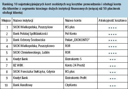 Spośród kont osobistych oferowanych przez instytucje finansowe posiadających co najmniej 50 placówek najwyżej oceniono rachunki Konto 24 Prestiż (BZ WBK.) i Konto Komfort (ING Bank Śląski). Uzyskały one najwyższą ocenę (pięć gwiazdek). Wysoką atrakcyjnością kosztową (cztery gwiazdki) charakteryzują się również następujące rachunki: Pakiet „EKOKONTO” (Bank Ochrony Środowiska), Optimum (Getin Bank) oraz IKS plus (SKOK im. Franciszka Stefczyka).
