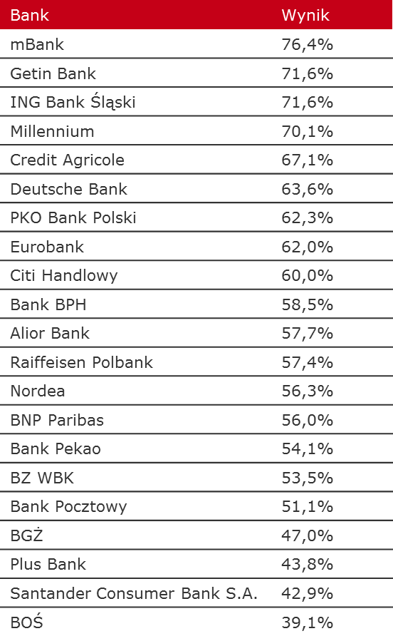 Pierwszą pozycję na podium zabrał mBank (76,4%), wyprzedzając Getin Bank oraz ING Bank Śląski (obydwa po 71,6%). W czołówce zmieściły się poza tym jeszcze Bank Millennium i Credit Agricole.