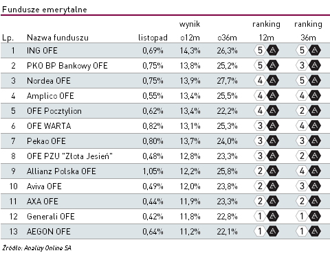 wszystkich funduszy emerytalnych. To obecnie jedyny fundusz, który może się pochwalić najwyższymi notami 5a zarówno w 36-cio, jak i 12-miesięcznym horyzoncie. Wysokie noty w obu zestawieniach utrzymuje także Nordea OFE (5a w 3-letnim i 4a w rocznym). Po miesiącu przerwy do grona funduszy z najwyższą notą 5a w zestawieniu 12-miesięcznym powrócił PKO Bankowy OFE.