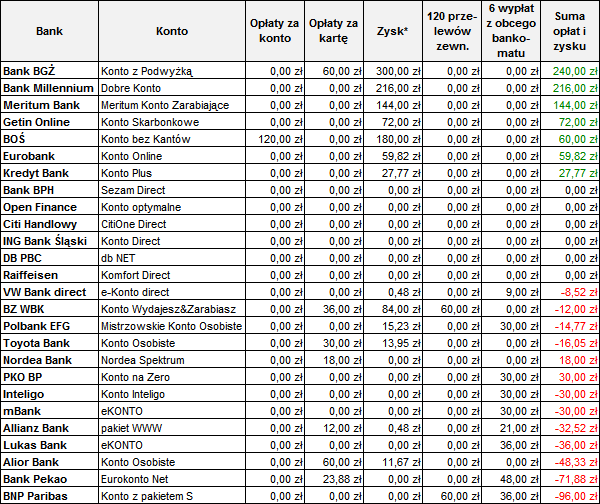 Rozbieżność w kosztach użytkowania rachunku z podobnej „półki” cenowej może być bardzo duża. 9 spośród 26 rachunków osobistych uwzględnionych w zestawieniu przyniesie po roku naszemu modelowemu posiadaczowi zysk – od symbolicznych kilku groszy po kwotę, której nie powstydziłaby się przeciętna lokata. Jednak w kilku „bezpłatnych kontach” koszty sięgną nawet kilkudziesięciu złotych.