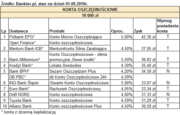 Najwyżej oprocentowane konto oszczędnościowe z dzienna kapitalizacją odsetek proponuje Polbank EFG. Bank co prawda obniżył w sierpniu stawkę z 5,5 proc. do 5 proc., ale jest to nadal oferta przebijająca propozycje konkurentów. Na drugim miejscu znajdują się ex aequo Open Finance i Meritum Bank ze stawkę 4,5 proc. Z informacji dostępnej na stronie internetowej Open Finance wynika jednak, że takie oprocentowanie promocyjne będzie obowiązywać tylko do 10 października. Na trzecim miejscu uplasował się Bank Millennium, który wznowił promocję konta oszczędnościowego. Bank proponuje 5,5 proc., ale tylko dla nowych środków wpłaconych w okresie promocji i przy miesięcznej kapitalizacji odsetek. Podobną akcję prowadzi ING Bank Śląski, ale ze stawkę 5 proc.