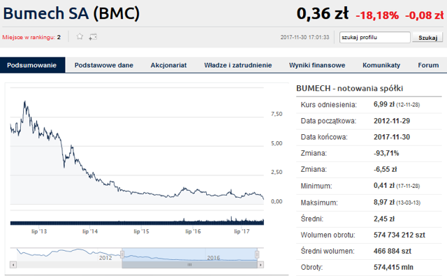 Powodów do radości nie mają także akcjonariusze drugiego w listopadowym zestawieniu Bumechu. Spółka wróciła wprawdzie na podium po półtora roku przerwy, powód zwiększonego zainteresowania jest jednak oczywisty i bolesny. 23 listopada pojawił się wniosek o otwarcie postępowania restrukturyzacyjnego w trybie przyspieszonego postępowania układowego. Złożyła go sama spółka, która szukała ochrony przed windykatorami. Od początku października akcje Bumechu - które, patrząc z dłuższej perspektywy, i tak były już bardzo dalekie od historycznych maksimów - potaniały o 60 proc.