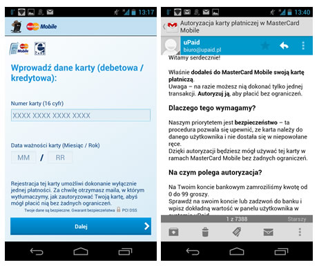 Na ekranie zlecenia płatności widzimy dane karty wybranej jako domyślna, a zatwierdzenie transakcji odbywa się poprzez wpisanie kodu CVC2 (z rewersu karty). Mamy także możliwość wyboru innej karty spośród wcześniej dopisanych do systemu. Dodawanie karty można przeprowadzić także na stronie uPaid.pl lub u innego dostawcy usługi MasterCard Mobile.