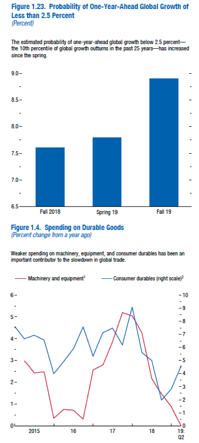 Po pierwsze, MFW ocenia, że w najbliższym roku ryzyko głębokiego spowolnienia światowej gospodarki, które można by właściwie nazwać recesją (wzrost poniżej 2,5 proc., 10 percentyl historycznego rozkładu dynamik PKB), wzrosło z ok. 7,5 do ok. 9 proc. Wzrost jest wyraźny, ale jednocześnie nie jest to raczej nic wielce niepokojącego. Takie ryzyko nie wykracza ponad to, co standardowo stanowi ryzyko szoków makroekonomicznych.