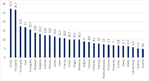 W najgorszym położeniu znajdują się młodzi Grecy (bezrobocie 58%), Hiszpanie (57,4%) i Chorwaci (52,4%). W Polsce odsetek młodych-bezrobotnych wynosi 27,2%, a w najlepszych pod tym względem Niemczech zaledwie 7,8%.