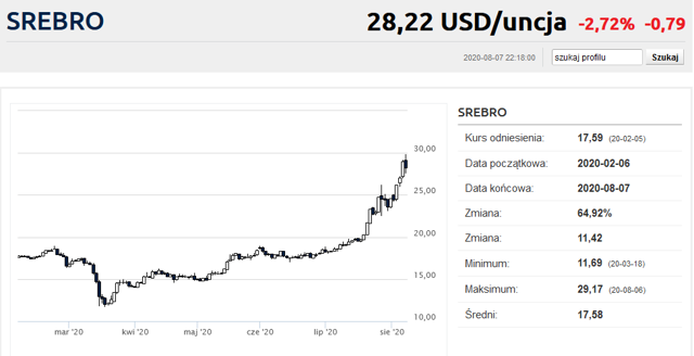 Od kilku tygodni srebro drożeje jeszcze szybciej, niż bijące historyczne rekordy złoto. Jednakże biały metal wciąż jest niemal o połowę tańszy, niż był w kwietniu 2011 roku. Analitycy Bank of America prognozują jednak kurs na 50 USD za uncję.