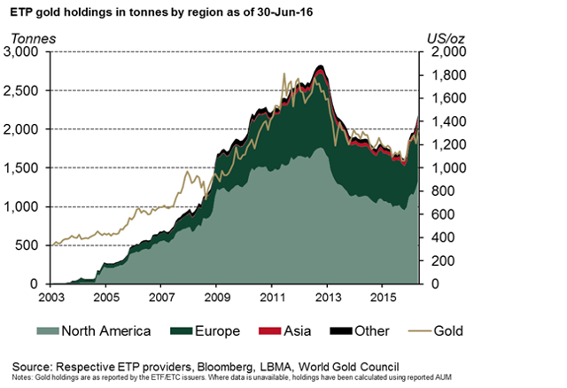Pół roku później sytuacja odwróciła się o 180 stopni. Na rynku zapanowała wręcz panika kupna – wielu zarządzających nagle zapragnęło uzupełnić portfele złotem traktowanym jako polisa ubezpieczeniowa na niepewne czasy. Niepewność wzmogły objawy kryzysu bankowego w Europie, podwyżka stóp procentowych w USA oraz geopolityczny wstrząs, jakim okazał się rezultat brytyjskiego referendum.