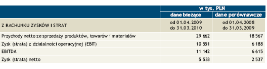 W całym roku obrotowym 2009/10 wypracowaliśmy ponad 5,5 mln zł zysku netto przy przychodach przekraczających 29,66 mln zł. Porównując wyniki do roku poprzedniego uzyskaliśmy wzrost przychodów o blisko 60% przy czym wzrost zysku netto był jeszcze bardziej dynamiczny i wyniósł ponad 118%.