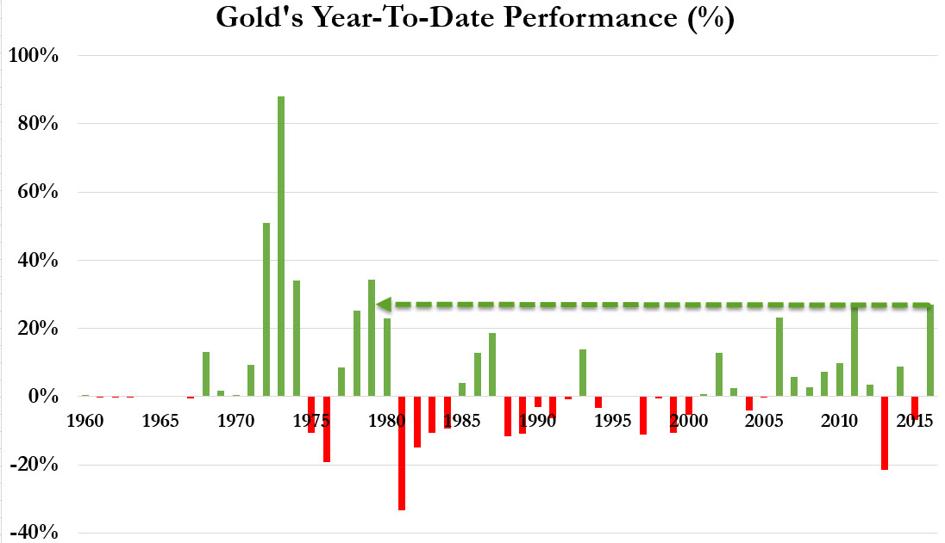 Od początku roku cena złota w dolarach amerykańskich wzrosła o 27,5%. Jak na razie jest to najlepszym wynikiem od roku 1980, gdy w atmosferze bańki spekulacyjnej kończyła się poprzednia wielka hossa (1968-1980), podczas której dolarowe ceny złota wzrosły 17-krotnie. Pomiędzy rokiem 1999 a 2011 kurs żółtego metalu wzrósł z 250 do 1920 USD/oz., by przez kolejne cztery lata spaść niemal o połowę, do 1.042 USD/oz.