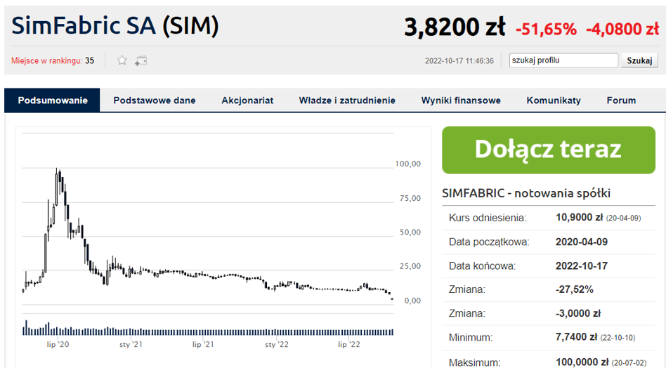 Historia od debiutu to również ciekawy osobny wątek, który opisał Adam Hajdamowicz, gdy akcje rosły w zawrotny tempie. Kurs SimFabric już trzy miesiące po wejściu spółki na NewConnect wynosił 100 zł na historycznym szczycie, czyli ponad 3 000 proc. więcej niż cena odniesienia akcji przed giełdowym debiutem. Kapitalizacja spółki przekraczała 620 mln zł i dawała miejsce wśród sześciu największych spółek gamingowych na całym rynku.