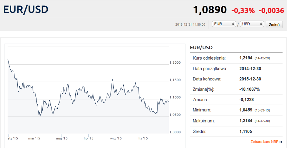 Jedną z lepszych inwestycji A.D. 2015 był amerykański dolar. „Zielony” kontynuował rajd z 2014 roku umacniając się o 11,4% wobec euro, zyskując 0,3% względem japońskiego jena, 5,8% wobec funta szterlinga i 5,5% wobec chińskiego juana. Frank szwajcarski stracił do dolara 0,8%.