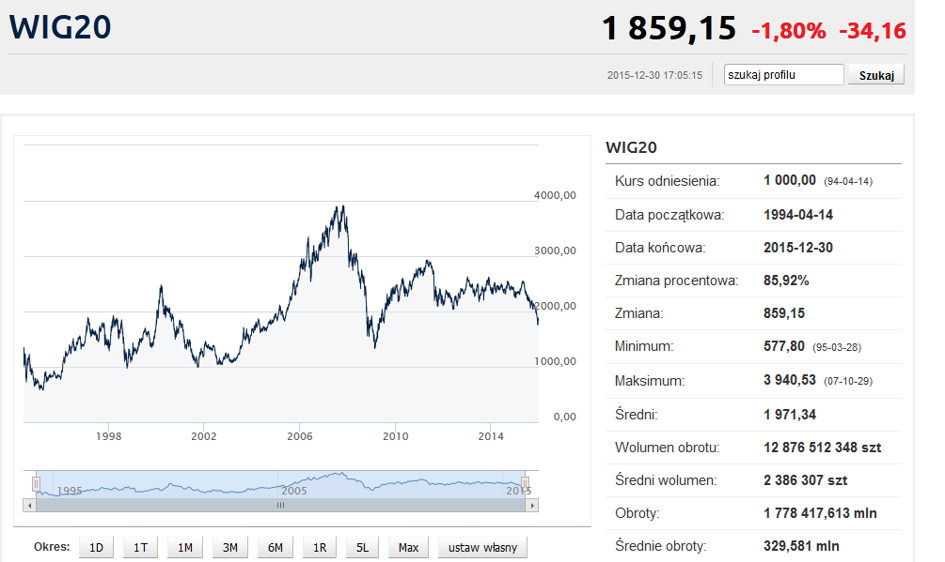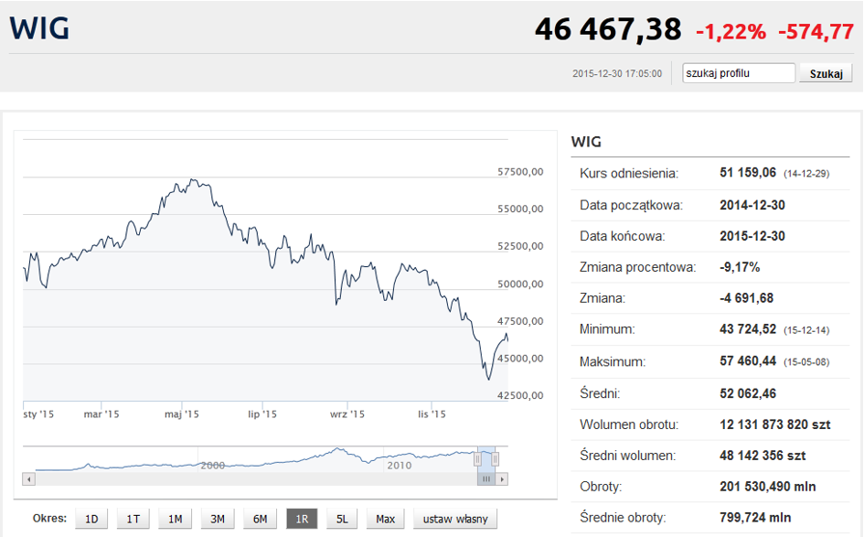 Polski inwestor miał jeszcze gorzej. WIG stracił w 2015 roku 9,6%. Stopy zwrotu z funduszy dłużnych zgromadzonych w bazie Bankier.pl wahały się od -2,1% (pomijamy likwidowany fundusz Inventum Obligacji) do 2,6%, przy średniej zbliżonej do zera. Roczna lokata bankowa założona w styczniu 2015 roku mogła przynieść w najlepszym razie 3,3% brutto, czyli 2,67% po uwzględnieniu podatku Belki. Sytuacji polskiego inwestora nie uratowało złoto, którego cena wyrażona w PLN spadła o 0,8%. Indeks złotego mierzący wartość polskiej waluty względem dolara, euro, funta szterlinga i franka szwajcarskiego obniżył się o 1,6% notując drugi stratny rok z rzędu.