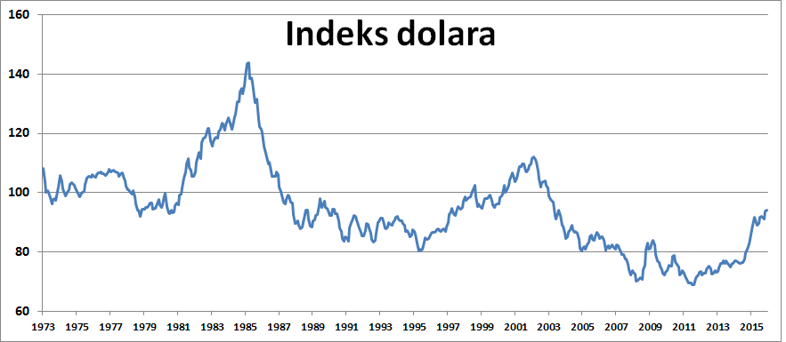 Do 24 grudnia ważony kursami 26 walut indeks dolara urósł o 11,6% po tym, jak w 2014 roku zyskał 10,5%. Był to czwarty z rzędu rok aprecjacji amerykańskiej waluty. Od historycznego dna z sierpnia 2011 roku indeks dolara ważony kursami walut najważniejszych partnerów handlowych USA wzrósł o imponujące 36%. Od momentu zerwania wymienialności dolara na złoto przez 44 lata obserwowaliśmy tylko dwie tak silne fale aprecjacji USD. Pierwsza miała miejsce w latach 1978-85 i wyniosła indeks dolara w górę o 54,8%. Druga fala z lat 1995-2002 umocniła „zielonego” o 34,1%.