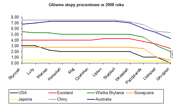 W pierwszej połowie roku pozostałe banki centralne były nastawione dużo bardziej restrykcyjnie. Europejski Bank Centralny pod wodzą Jean-Claude’a Tricheta w lipcu ostrożnie podwyższył cenę pieniądza o 25 pb. Stopy rosły też w Szwecji, Norwegii, Danii, Australii, Indiach oraz w większości państw rozwijających się (w tym w Brazylii, Polsce, Rosji czy Turcji). I gdy latem niektórzy zastanawiali się, kiedy Fed zacznie podnosić stopy, w sektorze bankowym rozpoczęło się istne pandemonium. Upadek banku inwestycyjnego Lehman Brothers wywołał przerażenie na rynkach finansowych. Panice tej ulegli także ludzie zarządzający bankami centralnymi. 10. października w skoordynowanej akcji na niezapowiedzianych posiedzeniach stopy procentowe zostały obniżone równocześnie w USA, Eurolandzie, Szwajcarii, Wielkiej Brytanii, Szwecji i Chinach. Akcja ta rozpoczęła szaleństwo obniżek kosztów kredytu, które obiegło prawie cały świat. Najwięcej fantazji wykazali flegmatyczni Anglicy (cięcie o 150 pb.) oraz chłodni Skandynawowie (w Norwegii i Szwecji cięto po 175 pb.). W efekcie na koniec roku cena pieniądza w USA spadła praktycznie do zera, w Japonii została obniżona do symbolicznego 0,1%, Szwajcarzy chcą utrzymywać Libor dla franka w przedziale 0,0-1,0%, a Brytyjczycy mają najniższe stopy od ponad 300 lat.