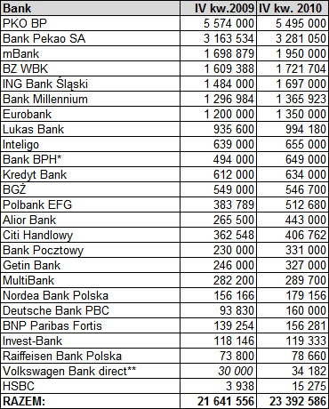 Porównując dane z końca 2009 i 2010 roku, widać, że wojna na konta przyniosła widoczny efekt ilościowy. W ciągu roku banki zwiększyły liczbę rachunków o 1,7 mln. Na koniec 2010 roku 25 ankietowanych przez nas banków prowadziło 23,4 mln kont osobistych. Najwięcej zyskały banki oferujące tanie konta internetowe i te, które prowadziły intensywne kampanie reklamowe.
