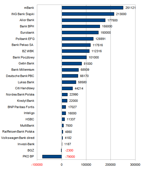 W ubiegłym roku spadła liczba ROR w PKO BP, który nie włączył się aktywnie do wojny na konta. Już jakiś czas temu przedstawiciele banku zapowiadali jednak, że skupią się przede wszystkim na wykorzystaniu istniejącej bazy klientów, stawiając na jakość sprzedaży (cross-selling), nie ilość. Mimo tego i tak PKO BP pozostaje niezagrożonym liderem rynku. Bank kilka dni temu zaprezentował nową ofertę kont osobistych, która ma zatrzymać postępujący od wielu miesięcy odpływ klientów.