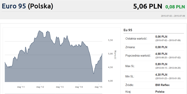 6 maja cena ropy Brent po raz pierwszy od grudnia 2014 zbliżyła się do poziomu 70 USD za baryłkę. Przez następne dwa miesiące „czarne złoto” taniało i w czwartek rano było notowane po 57,25 USD/bbl – czyli o przeszło 17% mniej. W tym samym czasie średnia detaliczna cena litra benzyny bezołowiowej w Polsce wzrosła z 4,79 zł do 5,06 zł i w ubiegłym tygodniu po raz pierwszy od listopada 2014 przekroczyła psychologiczny poziom pięciu złotych.