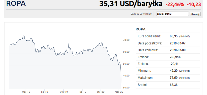 By dać im odpór, członkowie kartelu OPEC wraz z Rosją mieli uzgodnić cięcie produkcji surowca, fiasko rozmów i deklaracja Arabii Saudyjskiej, że będzie pompowała ropę pełną parą, sprawiły, że notowania i tak mocno przecenionego surowca załamały się. W poniedziałek za baryłkę ropy brent płacono 35 USD, poczas gdy w styczniu cena podchodziła pod 70 USD, a jeszcze w ten czwartek za baryłkę płacono ponad 50 USD.