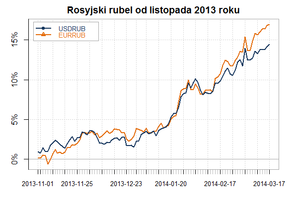 Rosyjski rubel od czasu początku kryzysu został zdewastowany przez inwestorów – euro zdrożało o niemal 17%, a dolar powędrował do góry o 14,5%. Spore straty zanotowały inne waluty naszego regionu – węgierski forint i czeska korona. Obecnie kurs EUR/HUF jest wyższy o 5,8% w stosunku do listopada, a EUR/CZK o prawie 6,1%. Z kolei kurs USD/HUF i USD/CZK są odpowiednio wyższe o 3,4% i 3,7%.