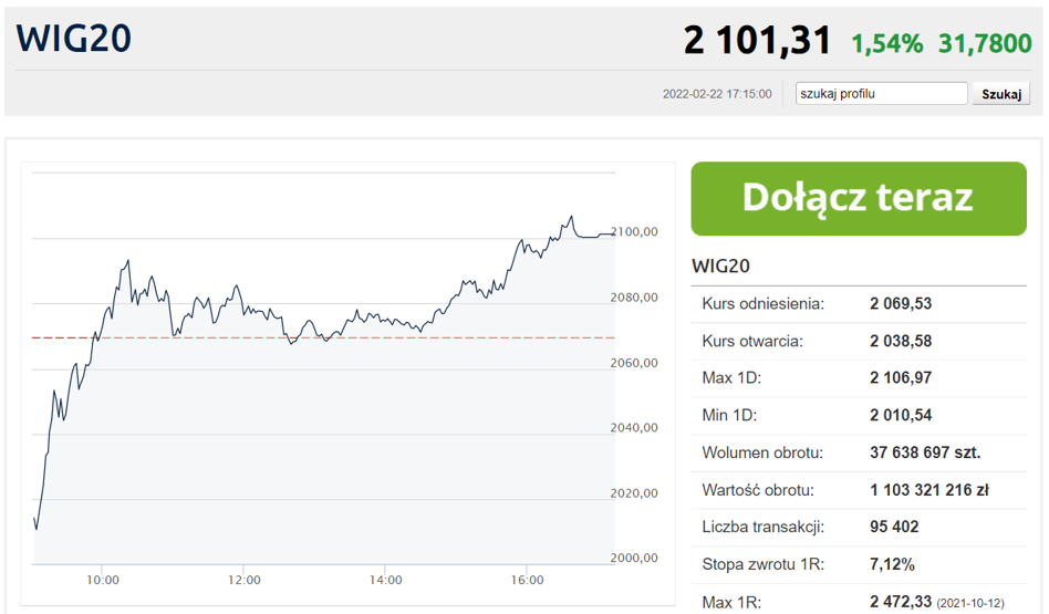 Poniedziałkowe doniesienia z Rosji, w których prezydent Putin wydał dekret o zatwierdzeniu niepodległości powołanych przez separatystów republik ludowych, a następnie polecił wojskom wkroczenie do wschodnich obwodów Ukrainy, były przyczyną porannych spadków na giełdach w całej Europie i w Polsce. Materializacja ryzyka, a w konsekwencji jego częściowe zdjęcie z rynków finansowych, pozwoliła na złapanie nieco oddechu w oczekiwaniu na dalszy rozwój sytuacji.