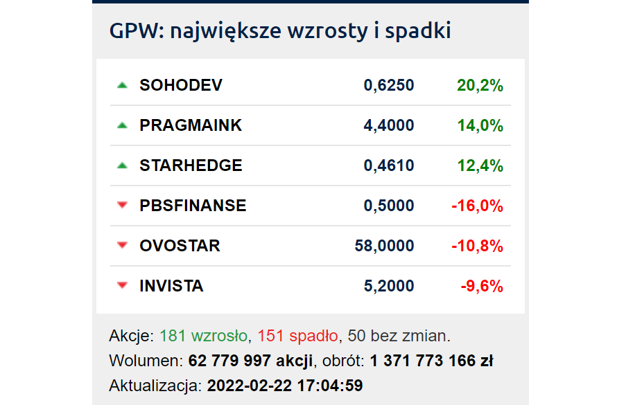 Najwięcej zyskał kurs PGNiG (9,33 proc.), który pokazał świetne szacunkowe, wyniki za IV kwartał. Do wyścigu o fotel lidera wzrostów włączyła się po południu JSW (7,96 proc.). Ewentualne zatrzymanie dostaw surowców z Rosji może podnieść ich ceny. W górę o ponad 3 proc. szły akcje Mercatora, PGE, KGHM-u i Allegro. Zwyżce Allegro (4,97 proc.) towarzyszyły jedne z najwyższych obrotów na GPW, rzędu ponad 101 mln zł. Allegro podało, że uruchamia anglojęzyczną wersję swojej platformy, niedługo ruszy dedykowana domena allegro.com. Jeszcze tylko KGHM, PKO BP i Pekao przekroczyły poziom 100 mln, z tym ostatnim jako liderem (155 mln zł)