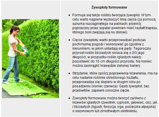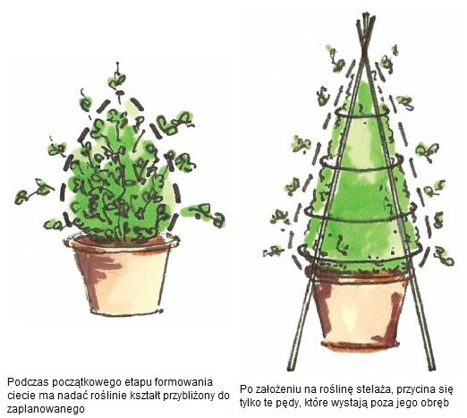 Przycinanie do formy Podczas cięcia formującego warto posiłkować się sznurkami, listewkami czy bambusowymi tyczkami. Można skorzystać z gotowych szablonów (metalowe, drewniane lub bambusowe stelaże lub inne metalowe formy, często w kształcie zwierząt, które mocuje się w doniczce, w której rośnie krzew). Szablony przydają się szczególnie do tworzenia bardziej skomplikowanych figur. Warto pamiętać, że na początku roślina jest mała i dopiero z czasem osiągnie kształt formy oraz zagęści się dzięki przycinaniu. |