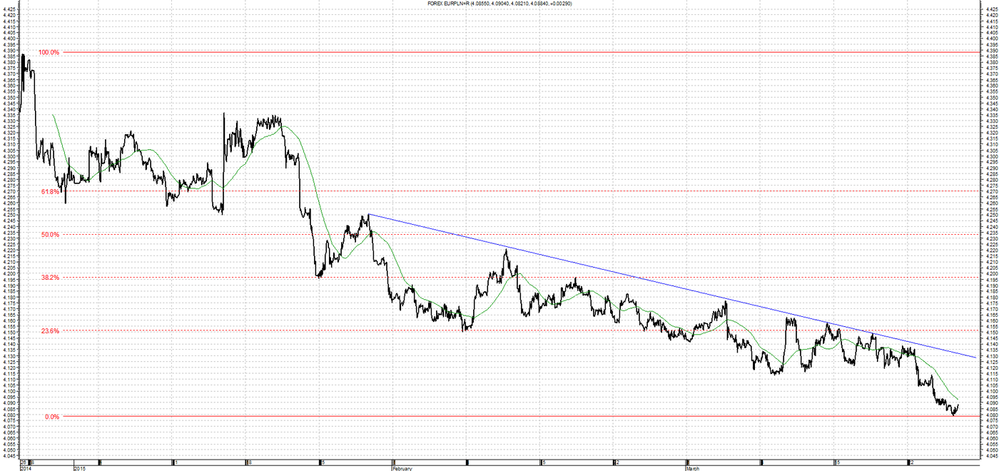 Kurs EUR/PLN po odbiciu się od linii oporu gwałtownie spada. Osiągnięte zostało dwuletnie minimum w okolicach 4,0800. Ten poziom w najbliższych dniach powinien stanowić wsparcie.