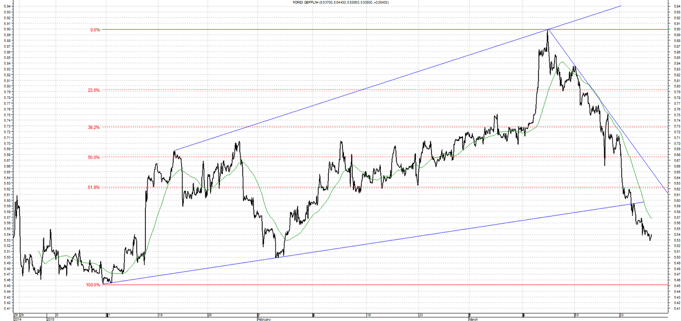Na wykresie zaobserwowaliśmy wybicie dołem z kanału wzrostowego. Kolejnym ciekawym poziomem są lokalne minima czyli 5,4525. W przypadku korekty ostatnich spadków opór stanowić będzie poziom 5,6000.