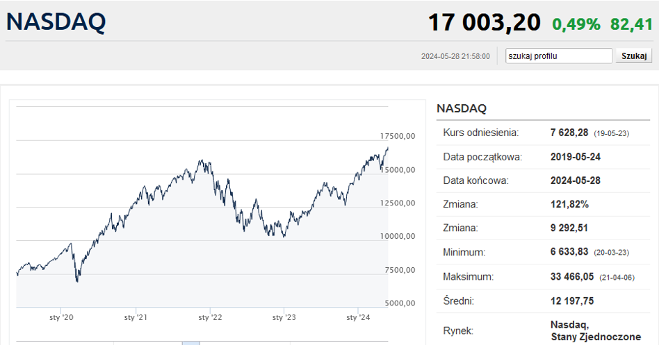 Mimo to Nasdaq Coposite zdołał zyskać 0,59% i na koniec wtorkowej sesji po raz pierwszy w historii sięgnął 17 000 punktów. Wszystko to było zasługą w zasadzie jednego papieru., Akcje Nvidii poszły w górę o ponad 7% osiągając cenę 1 140,59 dolarów. „Najważniejsza giełdowa spółka świata” warta jest już prawie 2,7 biliona dolarów, co jest zasługą fenomenalnej dynamiki zysków i przychodów. W ubiegłym tygodniu kalifornijska spółka podała, że w zeszłym kwartale obrachunkowym zarobiła prawie 6-krotnie więcej niż rok wcześniej.