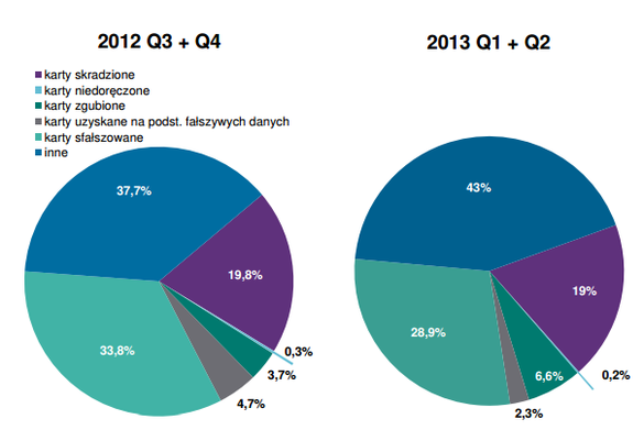 Jak podaje Narodowy Bank Polski, w I półroczu 2013 r. liczba operacji oszukańczych dokonanych kartami płatniczymi wyniosła 27,7 tys. i wzrosła o 11,5 proc. w porównaniu do II półrocza 2012 r. (24,9 tys.). Najwięcej transakcji oszukańczych banki raportowały w kategorii "Inne" (43 proc.). Tu trafiają przede wszystkim transakcje dokonywane bez fizycznego użycia karty, czyli internetowe i telefoniczne. Na drugim miejscu pod względem liczby fraudów były transakcje dokonane kartami sfałszowanymi (28,9 proc.). Trzecie miejsce zajmują transakcje wykonane kartami skradzionymi (19 proc.).