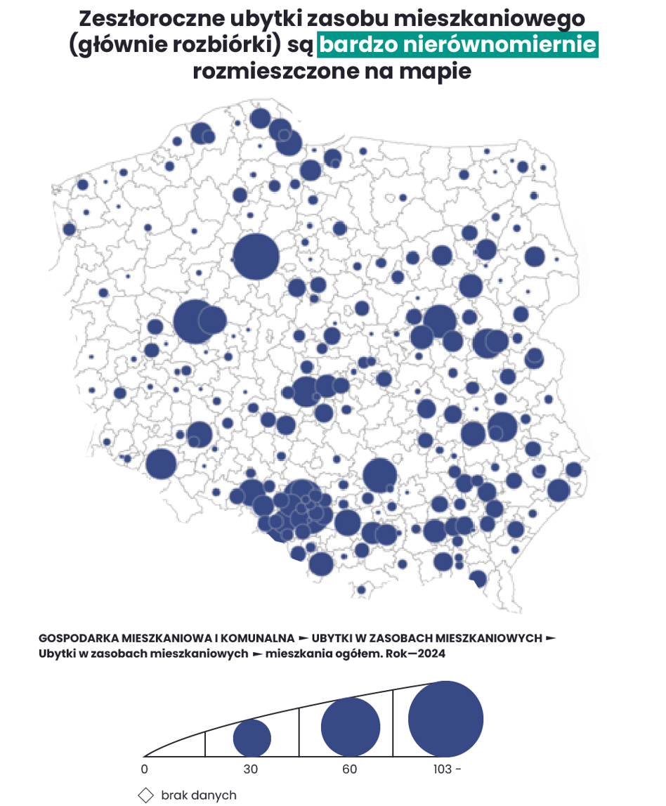 Zmiany sposobu użytkowania domu lub mieszkania na niemieszkalny są rzadkie, więc można traktować ubytki zasobu mieszkaniowego przede wszystkim jako efekt rozbiórek. GUS podaje, że w całym minionym roku na terenie Polski takich ubytków było bardzo mało. Dotyczyły one około 2600 lokali oraz domów. Opisywana sytuacja nie zaskakuje, ponieważ od 2010 r. ogólnopolski wynik ani razu nie przekroczył poziomu 3500.