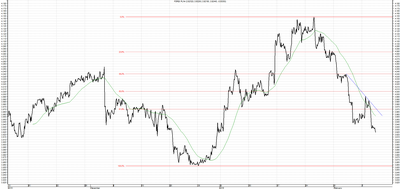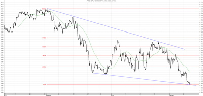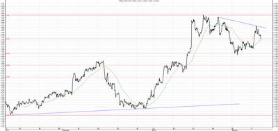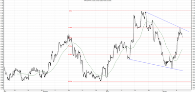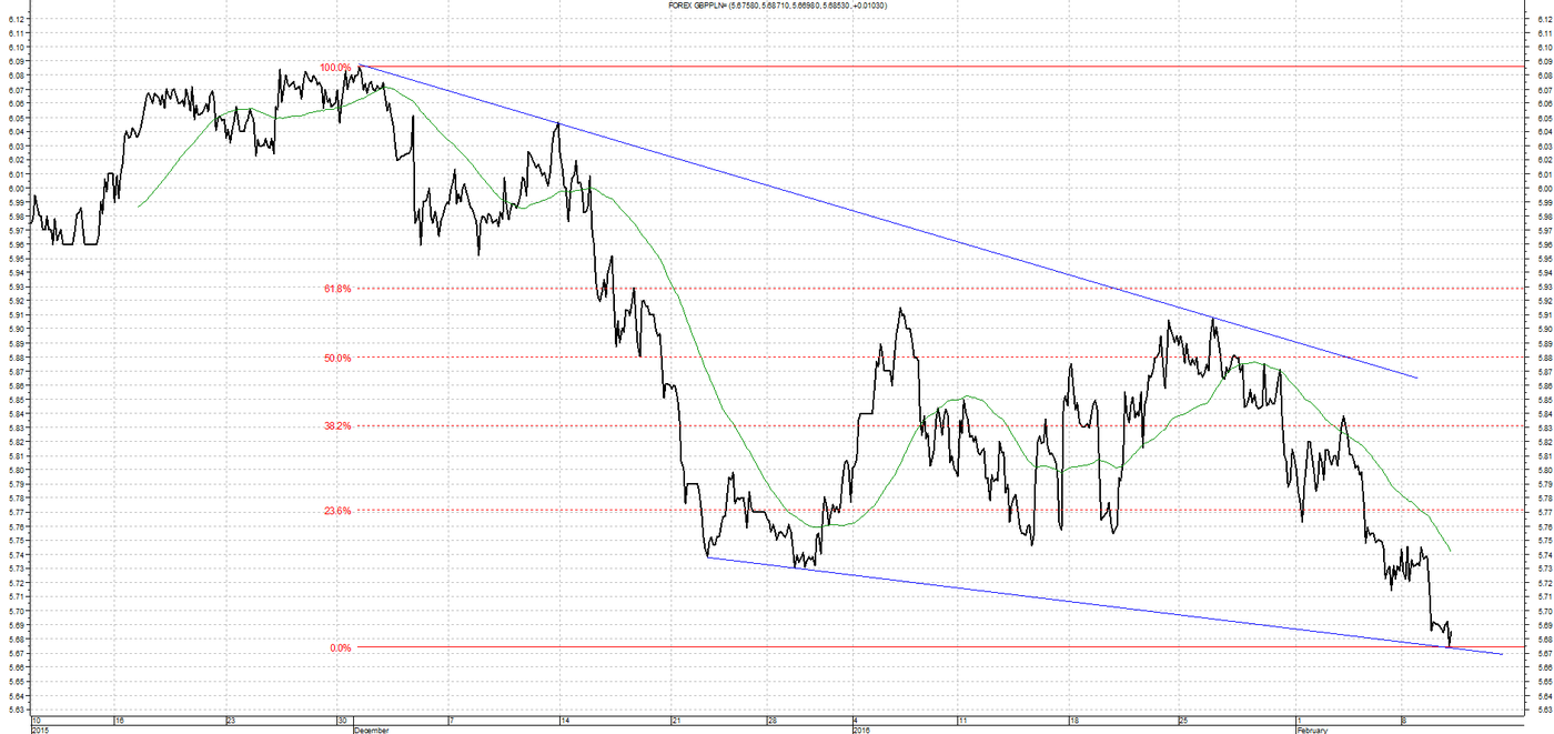 Kurs GBP/PLN od połowy października porusza się w silnym trendzie wzrostowym po czym zawrócił i przeszedł w trend spadkowy. Najbliższym oporem dla ruchu w górę są ostanie maksima na poziomie 5,9100. W przypadku kontynuacji spadków ważnym wsparciem jest minimum obecnego ruchu, czyli poziom 5,6800.