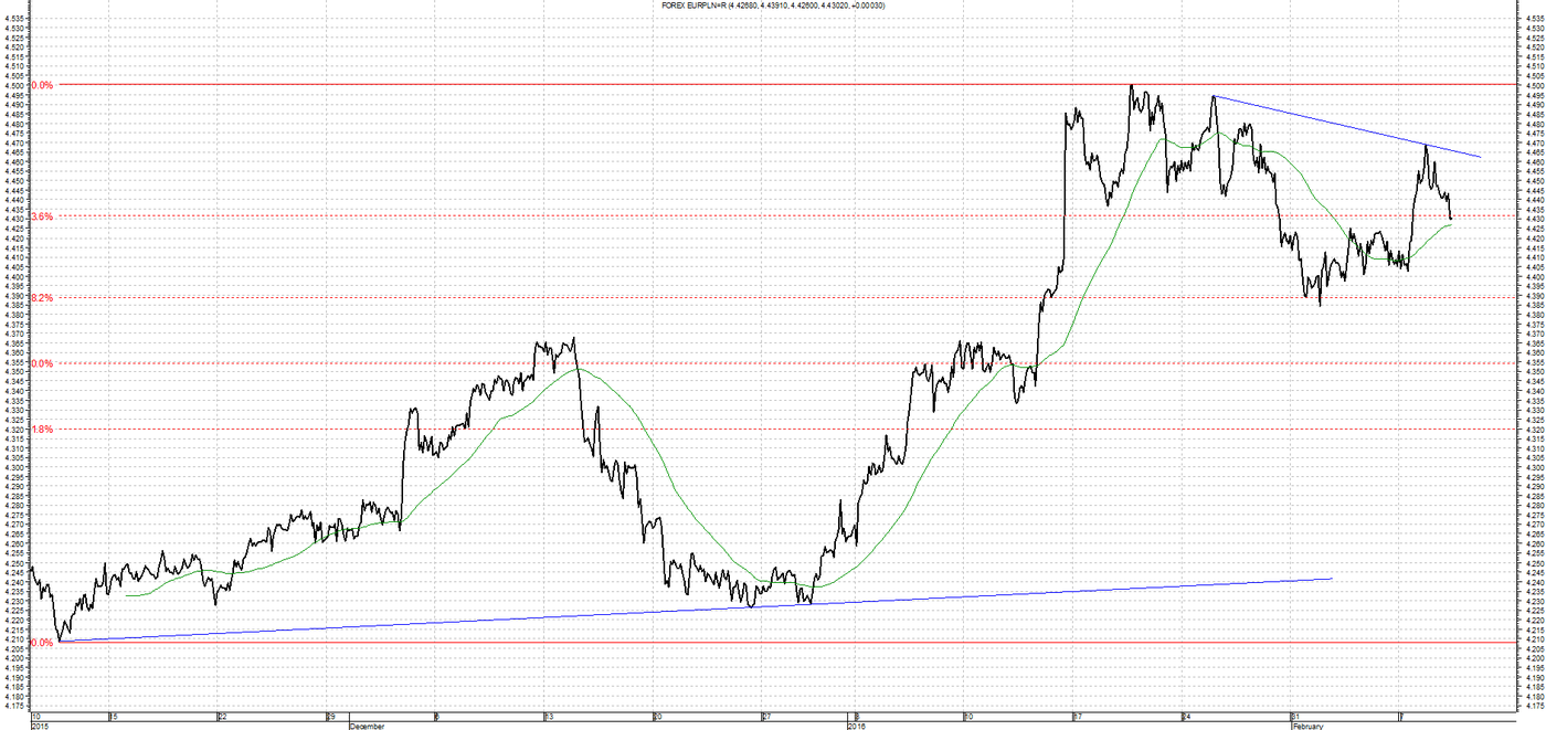 Kurs EUR/PLN powraca do wzrostów. Dla ruchu w górę oporem jest obecnie poziom 4,5100 zł, gdzie kurs dotarł po obniżce ratingu. W przypadku spadków wsparcie stanowić będą ostatnie minima lokalne na 4,3850.