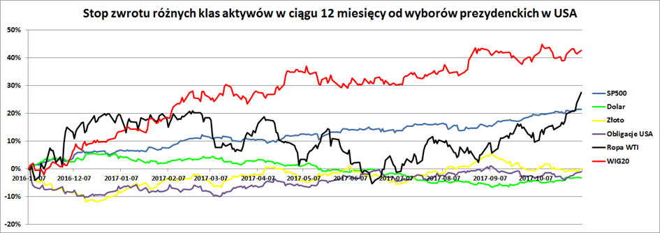 Równie imponujące wyniki „dowiozły” indeksy nieamerykańskie. Niemiecki DAX jest na plusie o 29%, a japoński Nikkei225 od wyboru Trumpa zyskał 33,5%. Nasz WIG20 także może pochwalić się wręcz rewelacyjnymi osiągami: przez ostatnie 12 miesięcy zyskał imponujące 44%.