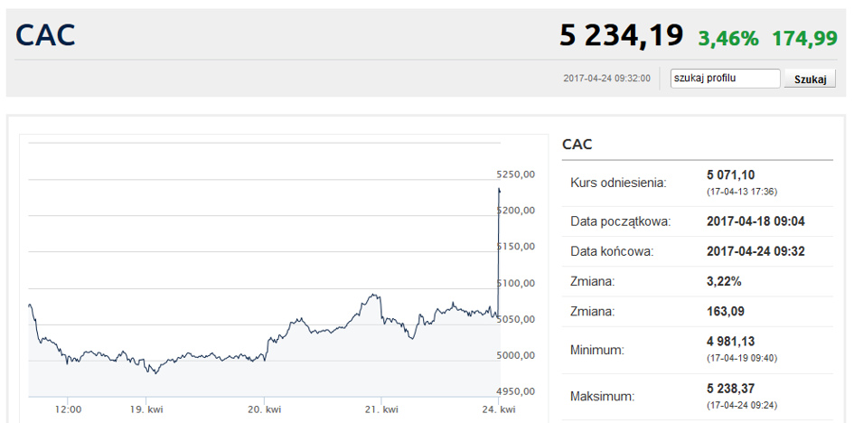 W drugiej turze wyborów prezydenckich we Francji (7 maja) zmierzą się Emmanuel Macron (23,75% głosów) i Marine Le Pen (21,53%). Taki scenariusz był oceniany jako najbardziej prawdopodobny, jednak wielu inwestorów (nauczonych ubiegłorocznymi doświadczeniami Brexitu i wyboru Donalda Trumpa) musiało upewnić się, że to właśnie taki wariant się zmaterializuje, tym bardziej, że przedwyborcze sondaże dawały całkiem spore szanse także kandydatom ostatecznie pokonanym. Więcej o samych wynikach wyborów przeczytasz w tym artkule.