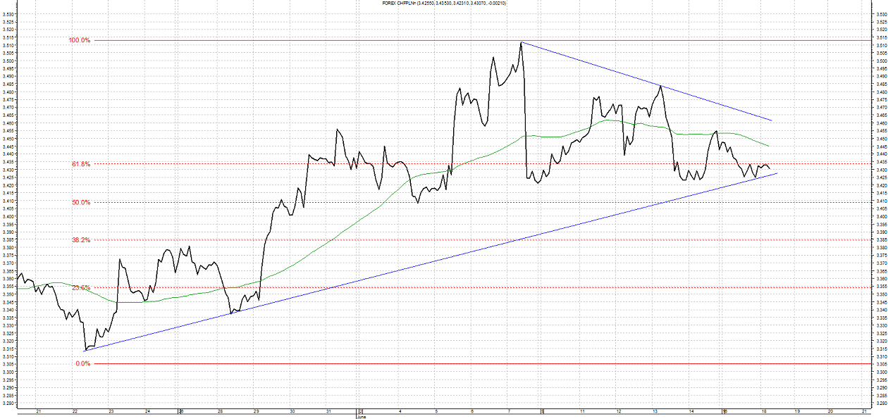 Frank szwajcarski porusza się w ramach wyrysowanego trójkąta. W ostatnich dniach kurs testował wsparcie jakim jest 3,4340 czyli 61,8% zniesienie Fibonacciego oraz linia trendu wsparcia formacji. W przypadku ruchu w górę najbliższym oporem jest linia łącząca maksima ostatnich tygodni na poziomie 3,4600. Wsparciem jest testowana niedawno linia łącząca minima ostatnich miesięcy przebiegająca obecnie na poziomie 3.4275.