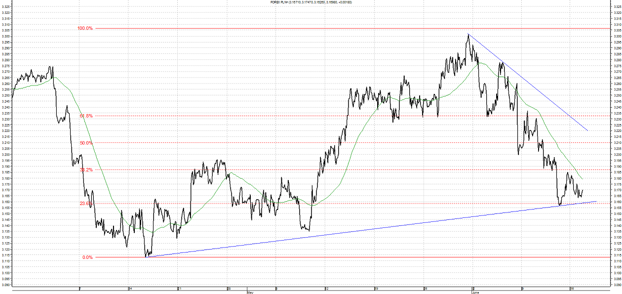 Kurs USD/PLN znajduje się w trendzie spadkowym. Kurs po dynamicznym ruchu w dół zatrzymał się dopiero na 3,1590 czyli 23,6% zniesieniu Fibonacciego. Obecnie mamy do czynienia z lekkim odreagowaniem i kurs zbliżył się do oporu w postaci 38,2% zniesienia Fibonacciego na poziomie 3,1875. Wsparciem będzie 3,1590 czyli linia długookresowego trendu wzrostowego.