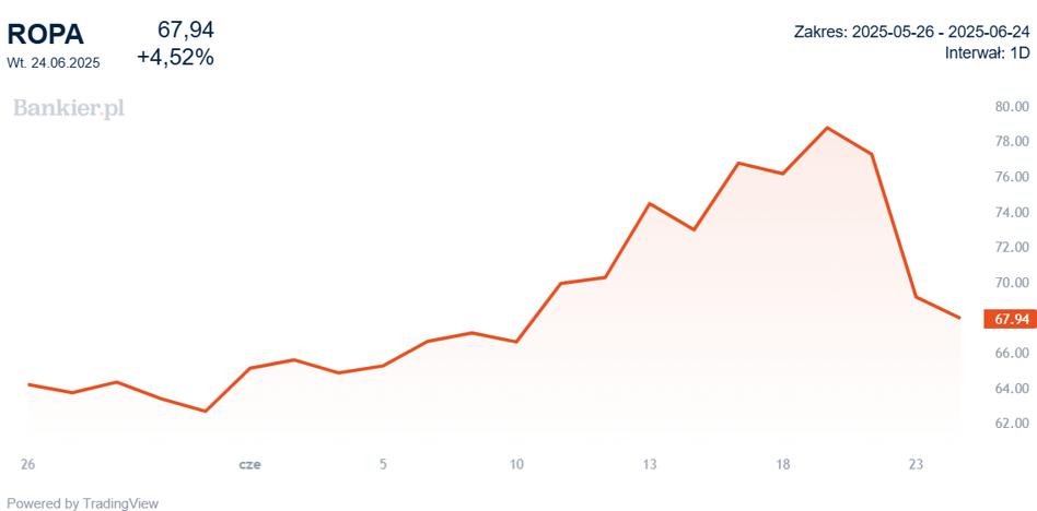 W pierwszej reakcji na doniesienia o możliwym zawieszeniu broni między Iranem i Izraelem, ceny ropy naftowej na światowych rynkach spadły o ponad 3%. W chwili pisania tego tekstu baryłka ropy naftowej Brent kosztuje 67,94 USD. Tym samym jest o ponad 16,5% tańsza niż w poniedziałek rano po tym, gdy rynki reagowały na amerykańskie bombardowanie instalacji nuklearnych Iranu. Cena baryłki ropy West Texas Intermediate wynosiła w tym czasie 65,89 USD.