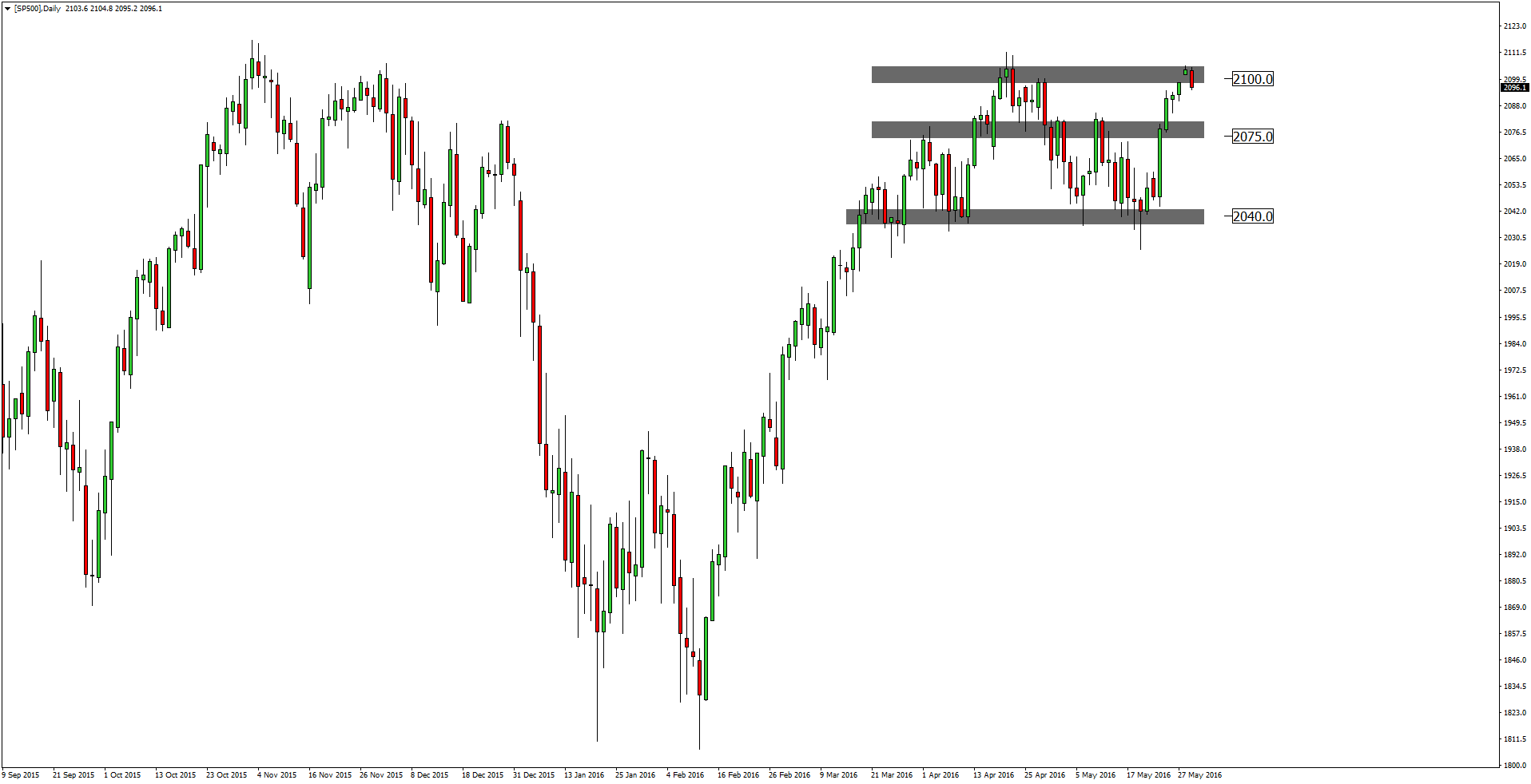 Indeks S&P 500 zakończył tydzień o 2,3% wyżej, przełamując bez problemu poziom oporu w okolicach 2075 pkt. Obecnie walczy o przebicie 2100 – 2110 pkt. i gdyby ta sztuka się udała możemy spodziewać się ataku na historyczne maksima w okolicach 2137 pkt.